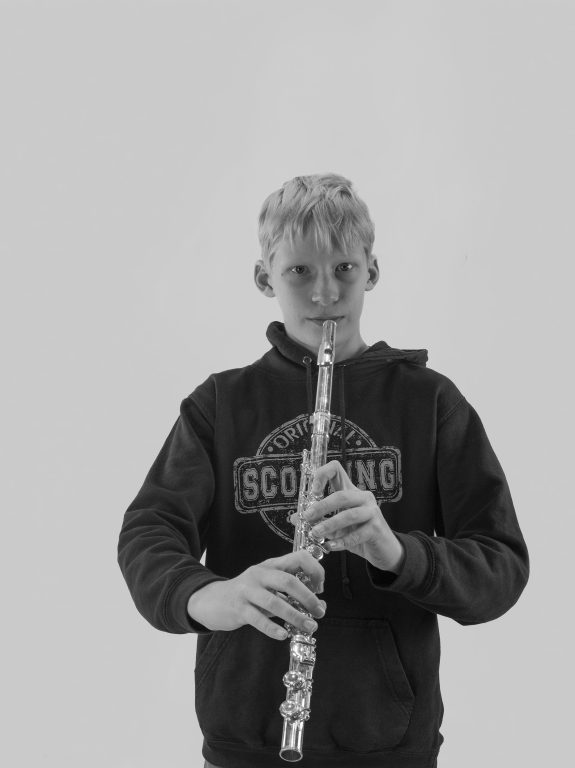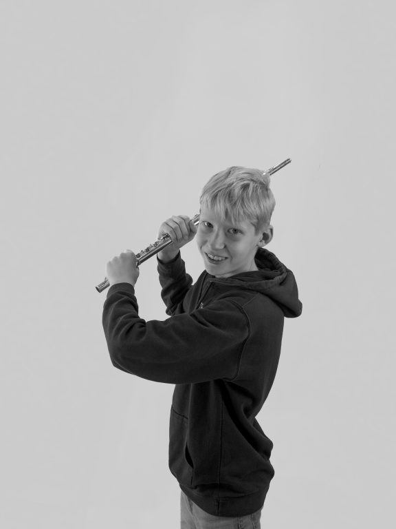 Hij wilde een blaasinstrument leren spelen en deed verschillende proeflessen. De dwarsfluit vond hij het leukst. Zo kwam hij terecht bij onze dwarsfluitdocent Jan. “Ik vind het heel leuk dat ik een meester heb,” zegt Simon, “dat heb je niet zo vaak bij dwarsfluit.” Hij vindt Jan een fijne leraar: “Meester Jan weet precies wat ik wel of niet moeilijk vindt en hij begeleidt heel fijn op de piano, dan geeft hij precies aan wanneer je moet beginnen.” Jan is ook Simons muzikale held, omdat hij zoveel kan en behalve fluit ook nog piano en fagot speelt.